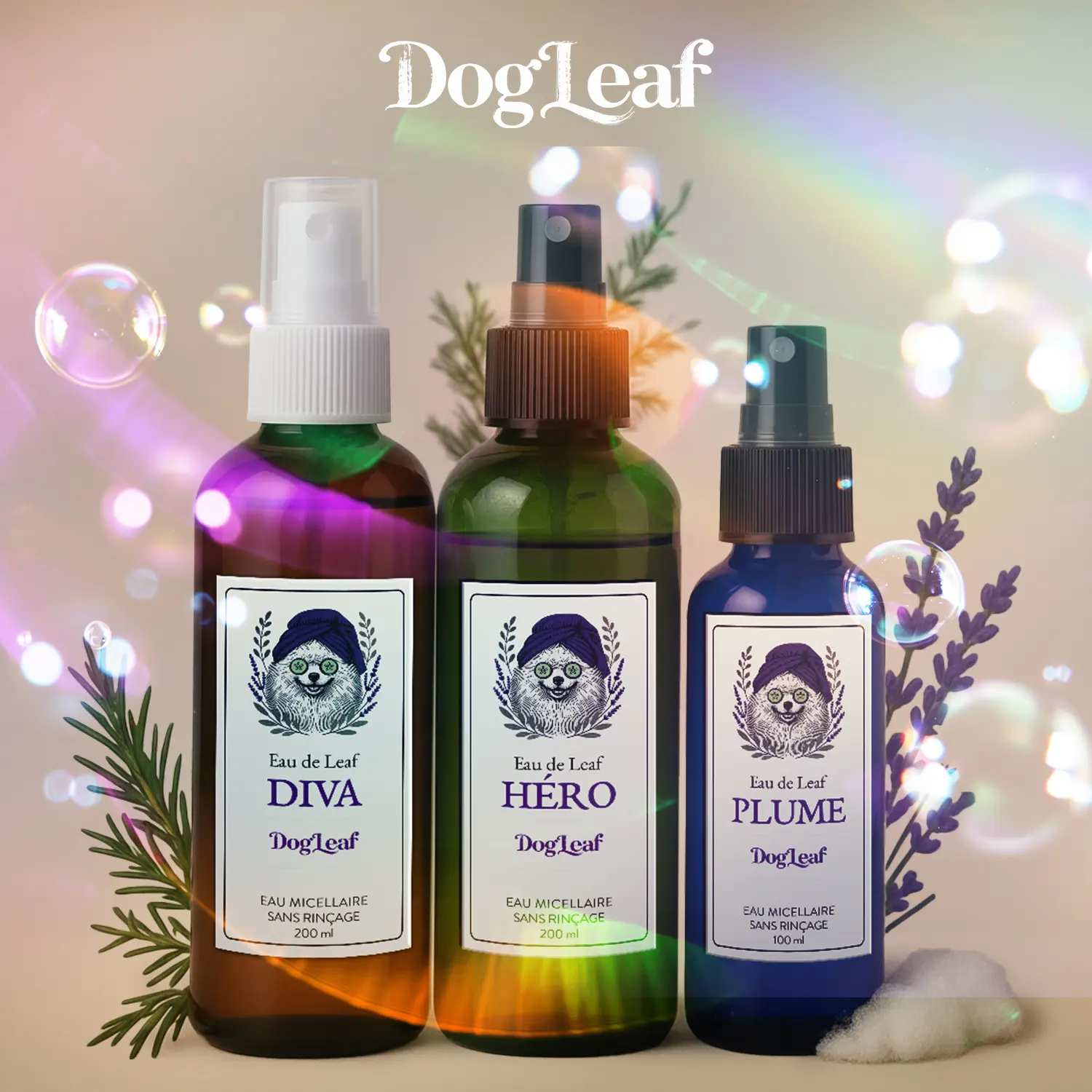 Ce sont trois signatures olfactives adaptées aux chiens : PLUME pour chiots, DIVA pour femelles, HÉRO pour mâles.